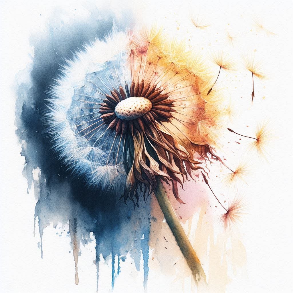 Imagine the form of your vision as a dandelion. We often forget or fear the impermanence of all form and its influence on our habits of control. When uninterrupted, this cycle causes systems of suffering and is what the Buddha described as clinging and grasping. Much of our lives are filled with habituated actions that resemble clinging to, grasping at, and gluing florets back onto dandelions long intended to disperse.
